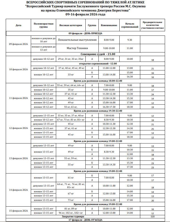 С 9 по 16 февраля на спортивной базе «Чехов» пройдет Всероссийский турнир по тяжелой атлетике памяти заслуженного тренера России М. С. Окунева на призы Олимпийского чемпиона Дмитрия Берестова.